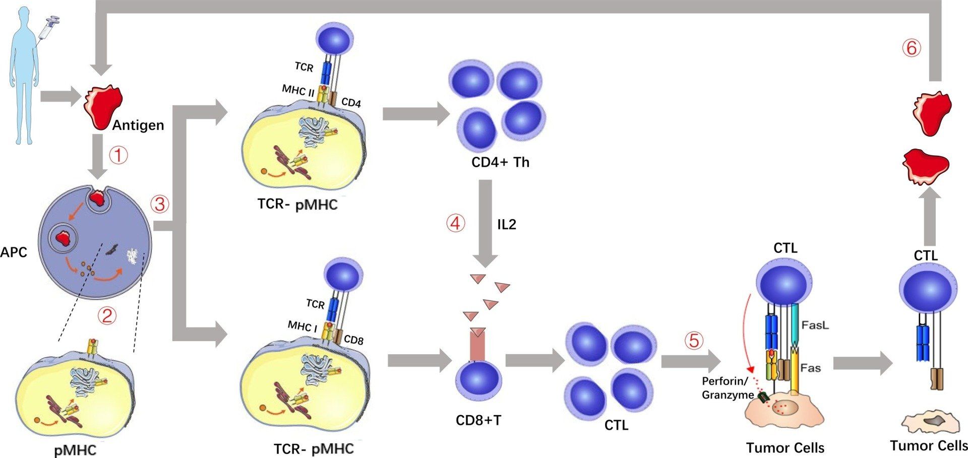 Here's a detailed view of the transformation of CD 4+ and CD8+ T cells into Cytotoxic T cells (CTL) that trigger a series of events that eventually kill tumor cells.